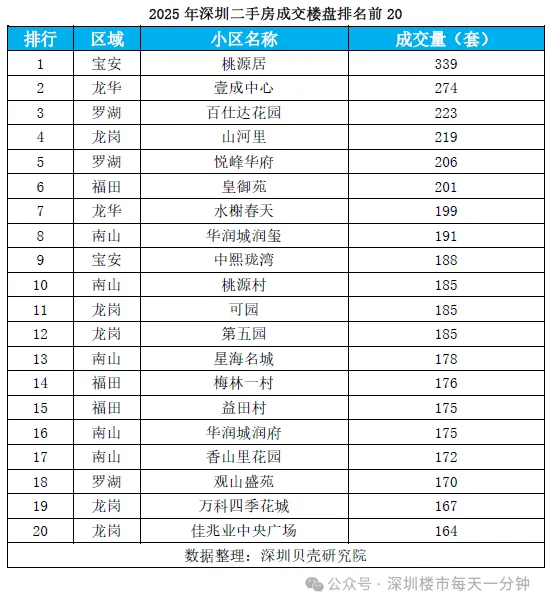 成交量创新高,那么具体是哪些楼盘在"扛大旗"?深圳贝壳研究院的另一份榜单给出了答案。这份"2025年深圳二手房成交楼盘排名前20"的榜单,揭示了当前市场的两大核心特征: