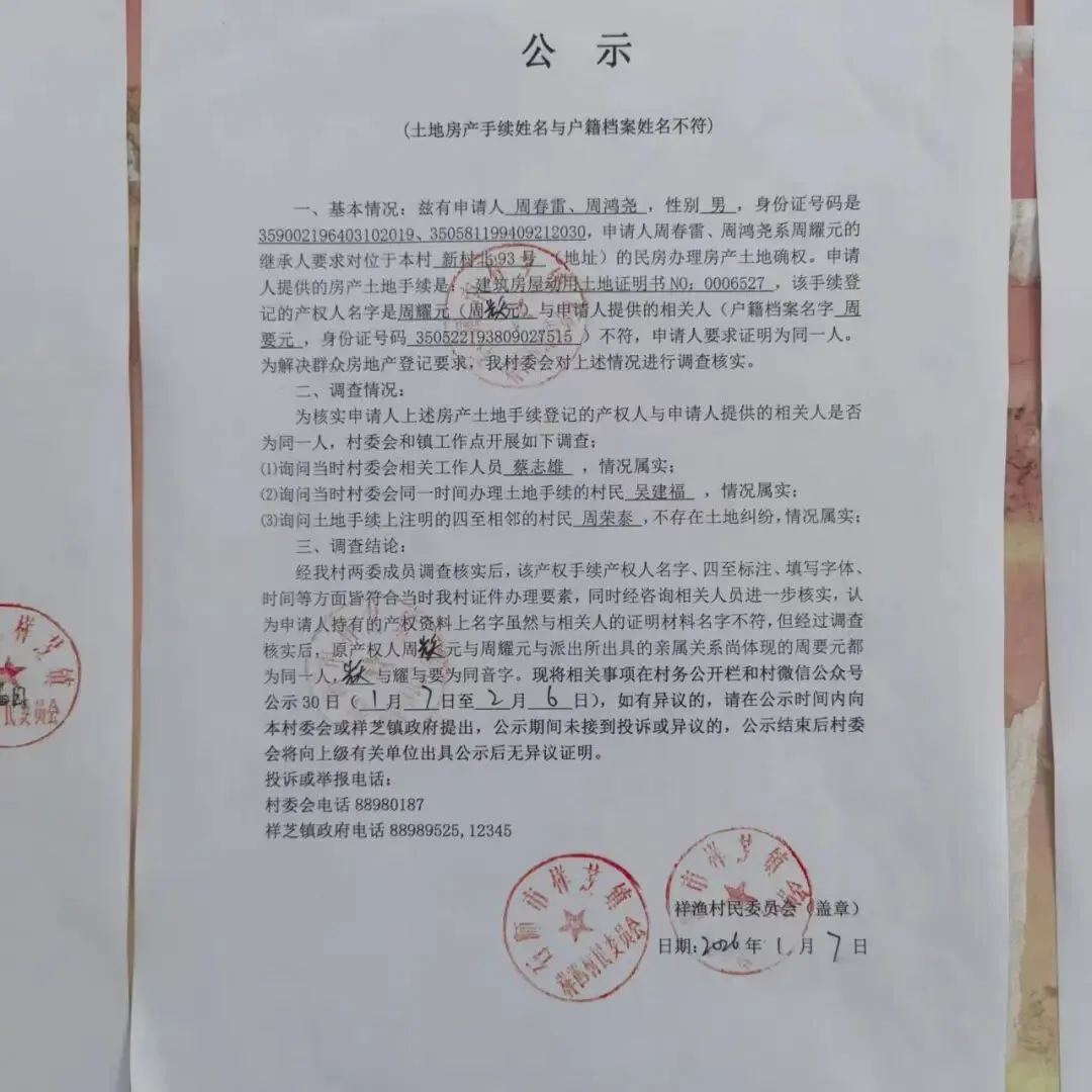 公示 土地房产手续姓名与户籍档案姓名不符公示