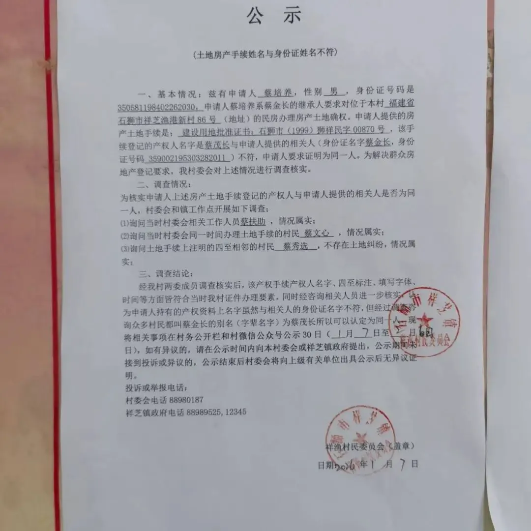 公示 土地房产手续姓名与户籍档案姓名不符公示