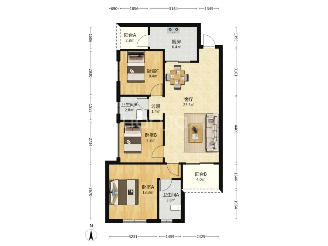 该套房源位于八方小区C区,建面约139㎡,精致装修大三房,售价349万,单价2.5万/㎡。