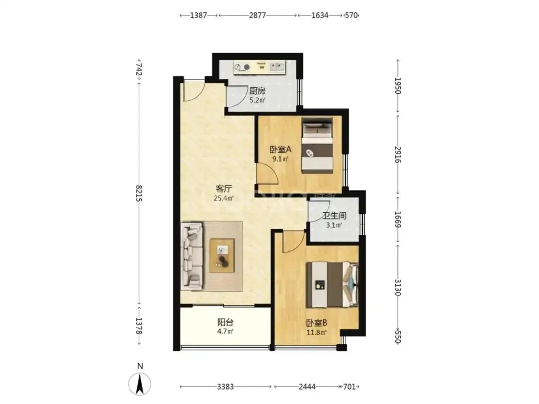 该套房源位于时代倾城二期,建面约87㎡,精装两房,售价58.8万,单价6751元/㎡。