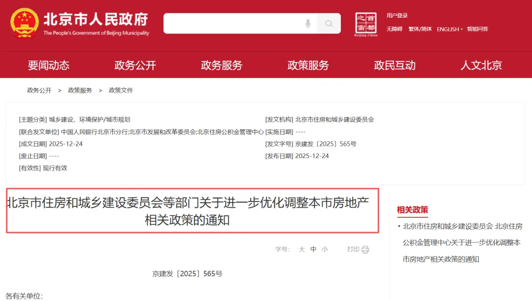 最近北京刚实施个房地产新政,是市住建委、市发改委、人民银行北京市分行、北京住房公积金管理中心联合发的,叫《关于进一步优化调整本市房地产相关政策的通知》,从12月24号就开始施行的。