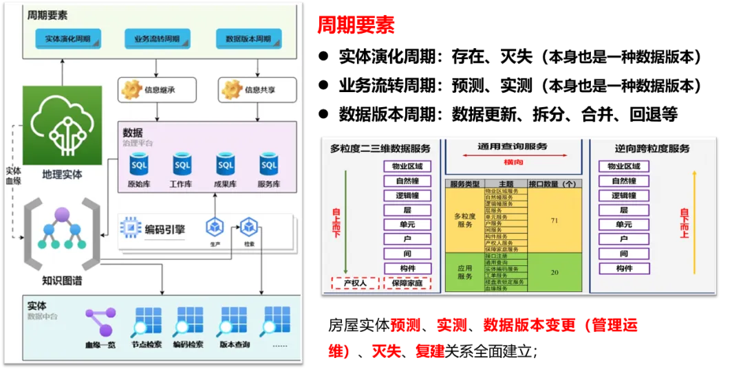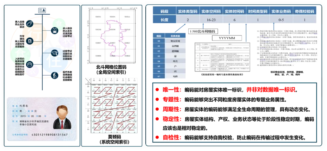 这里的编码是对实体的编码,不是对数据的编码。在计算机层面,人、房子、地块等都可以抽象成为一条数据,通过Guid标记存储在数据库中,但这个Guid对于实体对象对外扩展应用而言是没有意义的,需要有一个实体编码来支撑。就像人的身份证编码一样,可以跨越时间(生老病死)和空间(衣食住行),满足多部门信息共享和聚合。