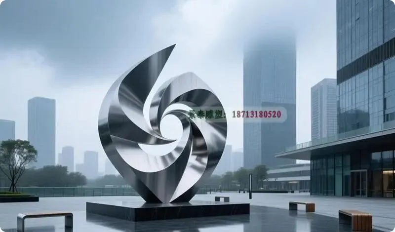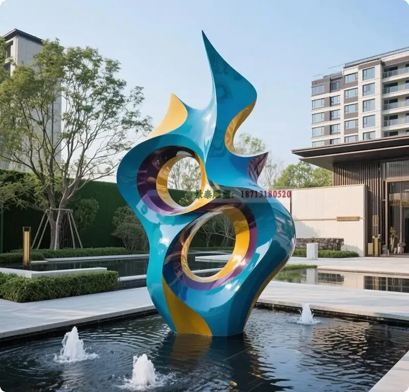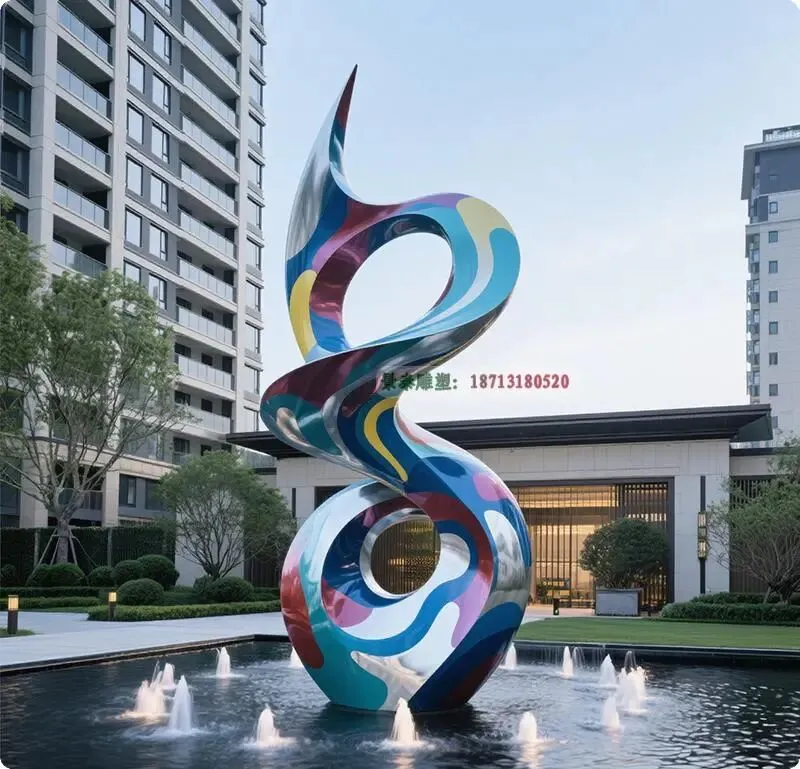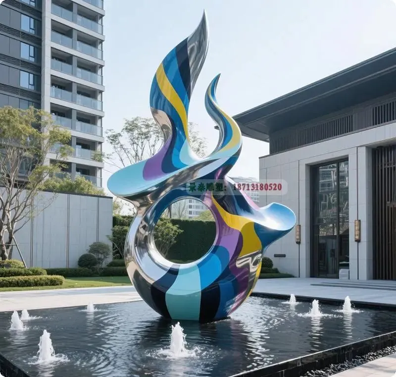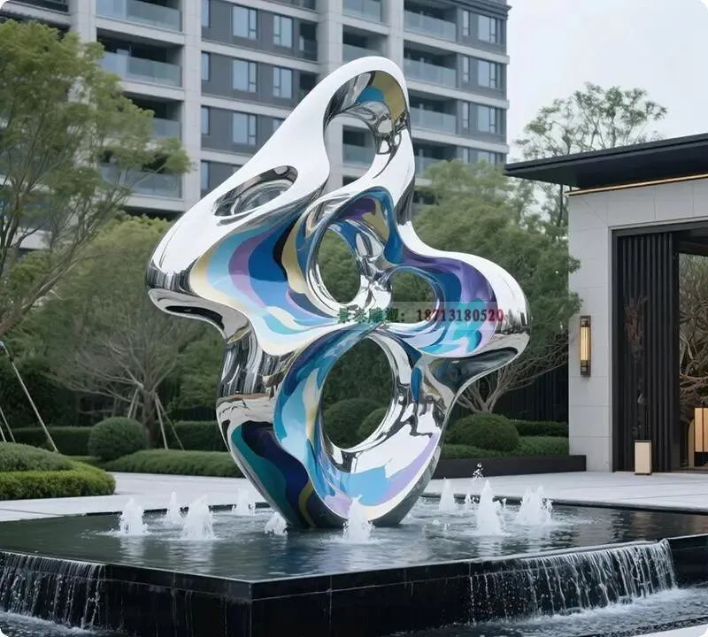 在当代地产景观设计中,水景装饰雕塑已成为提升空间美学与人文价值的重要元素。不锈钢雕塑凭借其**现代感、耐候性及可塑性**,成为水景设计的首选材质。通过先进的**喷镀工艺**,不锈钢表面可呈现镜面、拉丝、镀钛等多样效果,既能反射水光波影,营造动态视觉层次,又能与建筑风格和谐统一。
