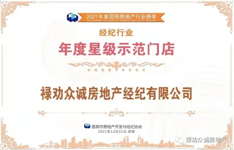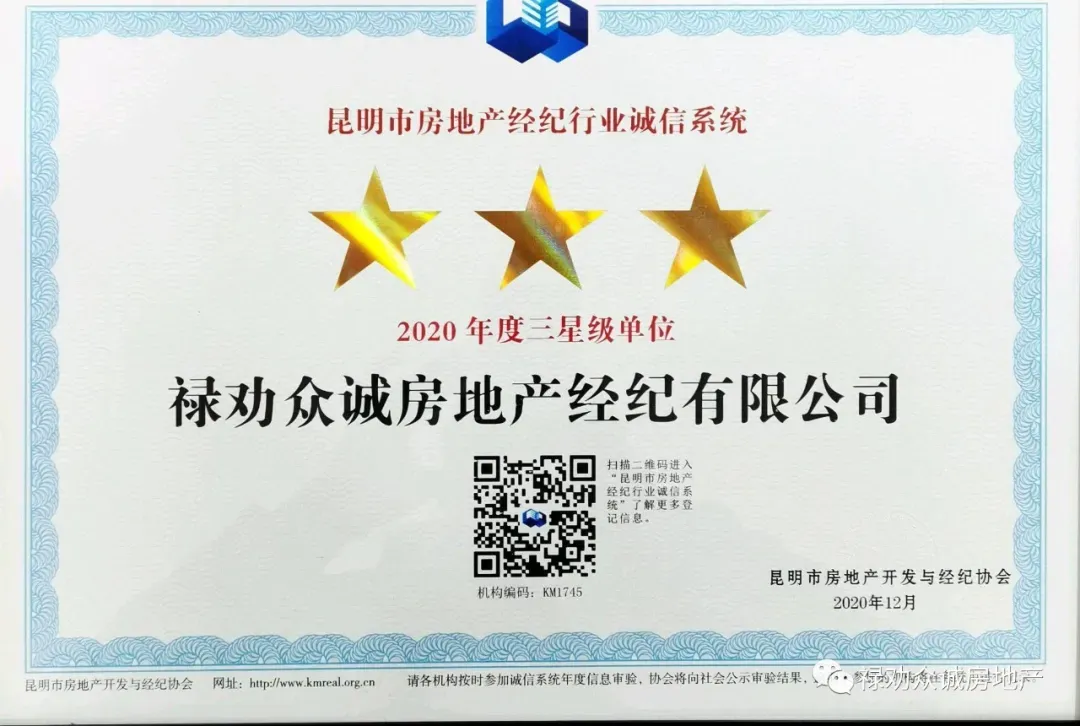 禄劝众诚房地产经纪有限公司感恩、正向、专注、实干,用“敢打仗、打硬战”的顽强作风攻克了一个个业务荆棘,斩获2020年昆明市房地产开发与经纪协会第四届会员单位;昆明市房地产经纪行业诚信系统2020年度3星级单位;2020年12月6日完成昆明市房地产开发与经纪协会诚信地产法律风险暨经纪机构门店店长培训课程,获得培训证书。