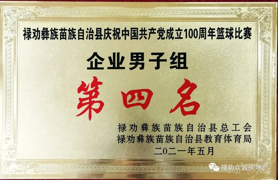 禄劝众诚房产经纪有限公司,在2021年5月禄劝县庆祝中国共产党成立100周年篮球比赛活动中,篮球代表队在没有外员,全部本土球员的情况下,诚心诚信、精诚合作、激情拼搏,展示了他们对身体强健不变的追求,勇夺企业男子组“第四名”