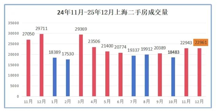 据上海网上房地产数据显示,2025年12月二手房网签成交合计22,961套(全口径数据包含商业、车位等),11月份22,943套,比11月上涨约0.08%!去年12月成交29,711套,同比去年12月下降约23%。2025年12月成交量已经是仅次于3、4月小阳春,成为近8个月以来成交的最高点。随着11月和12月连续达到约2.3万套的成交规模,市场筑底或已完成,翘尾明显!从月度成交套数的走势来看,2025年上海二手房市场呈现出“金三银四”的典型特征。3月份成交量达到29345套,为全年单月最高点;4月份虽有所回落,但仍维持在23416套的高位。进入下半年,市场热度有所降温,成交量基本稳定在1.9万至2.1万套的区间内。