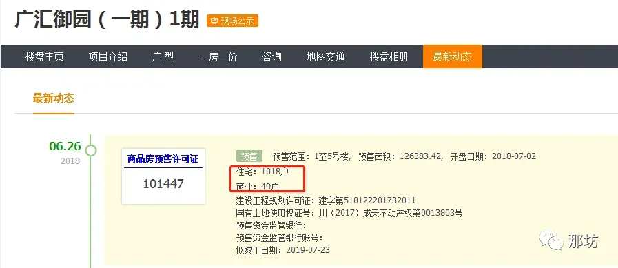 2018年6月26日广汇御园(一期)1期取得预售,一期1-5号楼合计住宅1018户,有附加备注:产业配套住宅项目,供应70年产权住宅房源;其中70年产权的住宅:1018户,40年产权的商业:49户