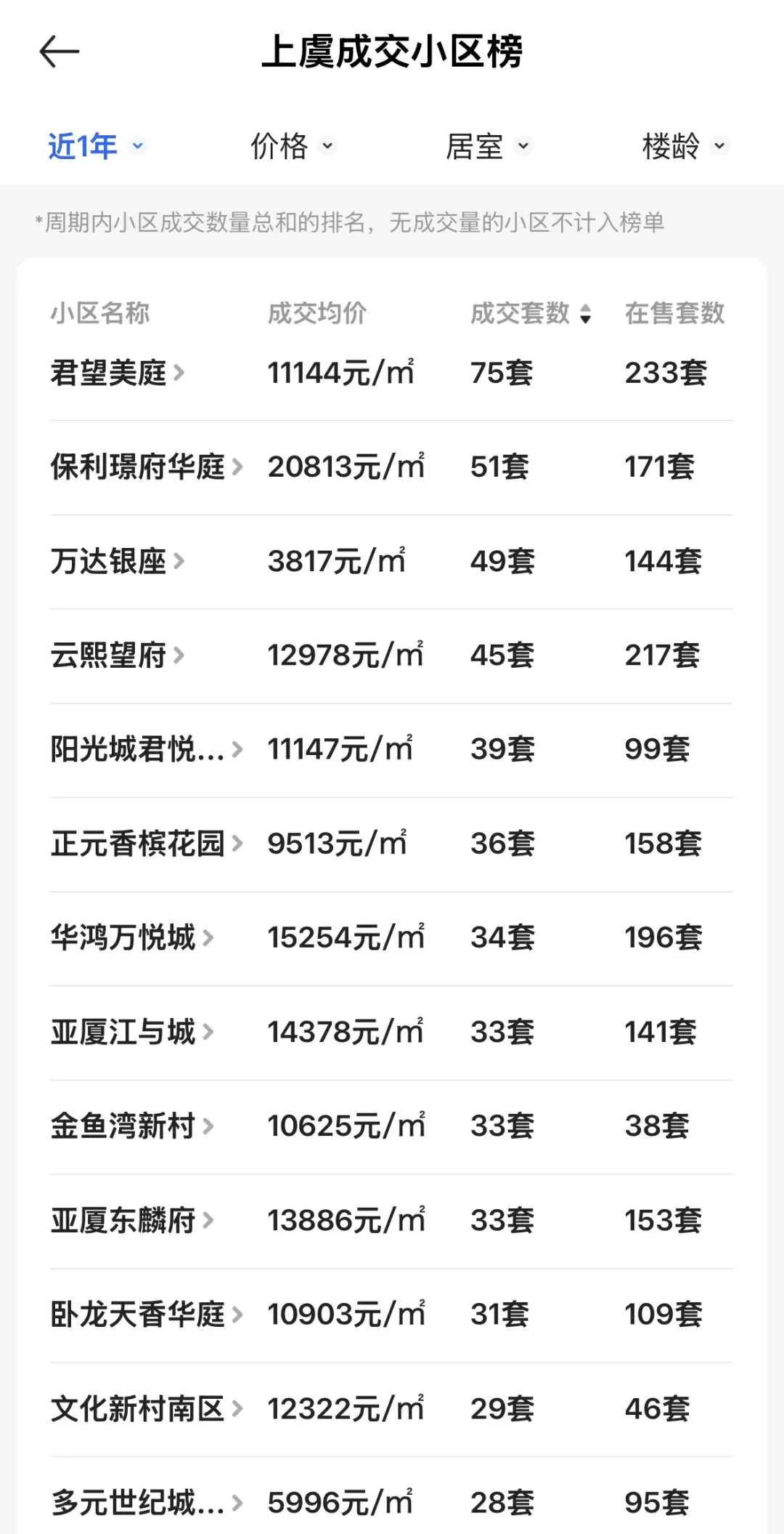 各区域近期二手房成交均价一览