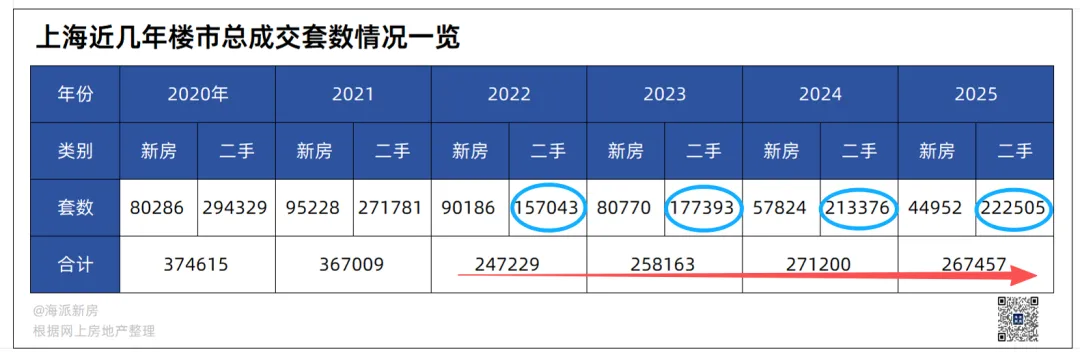 最后,我还想跟大家聊聊年度数据,可能大家也已经看了不少,2025年上海二手累计成交创近4年新高。但是,我认为这个数据不能单独看,我整理了一张表,可能大家从这张表里更能看到一些真相:首先,我们来看全年总成交量,2025年相比2024年是下跌的,但与2022、2023相比则是上涨的。这说明什么?我认为可以理解为上海楼市的总需求其实没有变坏,甚至可以说依旧很强劲;其次,分新房和二手房来看,则可以看出从22年以来新房成交量一直是下降的,但二手的成交量则一直在上涨;这也说明,在二手和新房选择之间,有很多人倾向了二手。原因,我认为是二手有了性价比。尤其是刚需群体,我看到了一个数据,2025年总价200万以下房源占比到43.89%,这是近6年的一个新高。但总体上,结合2025年的二手成交情况来看,我对市场有信心,因为总需求没有变差。而现在,大家也知道,上海这几年其实已经在严控新房增量,并且官媒《求是》还特别发声,说明已经非常受重视。而一旦新房增量减少,那么市场需求肯定会更多的转向二手市场,这对二手价格筑底稳定的利好意义不言而喻。前段时间,著名财经作家吴晓波举办了跨年演讲,在房地产领域,它也提了一个观点:北京、上海的小户型房产是未来十年中国所有房产中贬值可能性最低的房产。结合上海去年200万以内43.89%的成交活跃度,我觉得还是有一定的道理的,它不可能没有需求。也因此,2025年楼市很值得大家理性看待,尤其对于要买卖房子的朋友,希望你不要太悲观;全文完