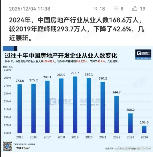 最后,想分享一组扎心又真实的数据:2024年中国房地产行业从业人数168.6万人,对比2019年巅峰期的293.7万人,下降了42.6%,几乎腰斩。这组数据背后,是无数地产人的选择与坚守。