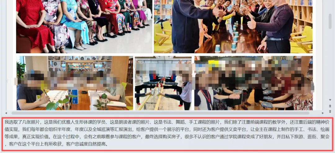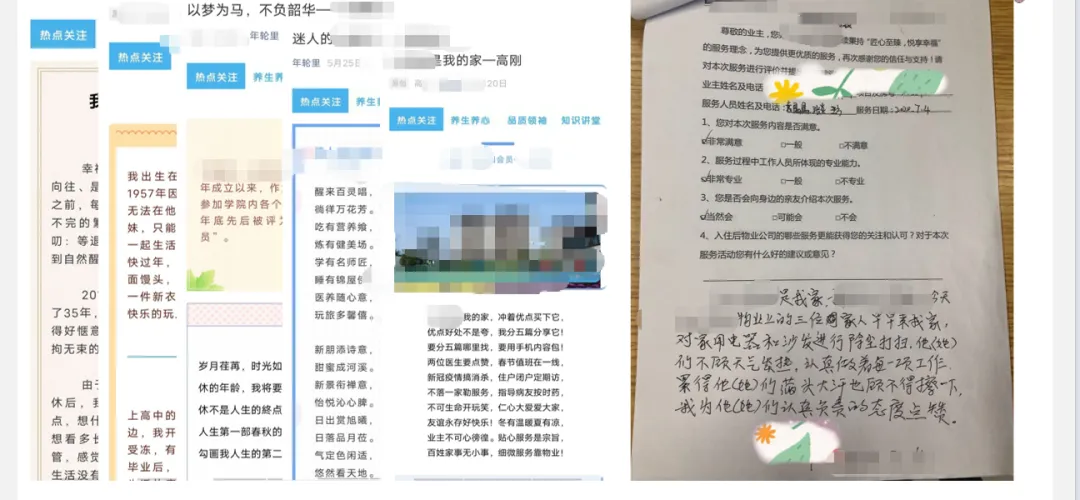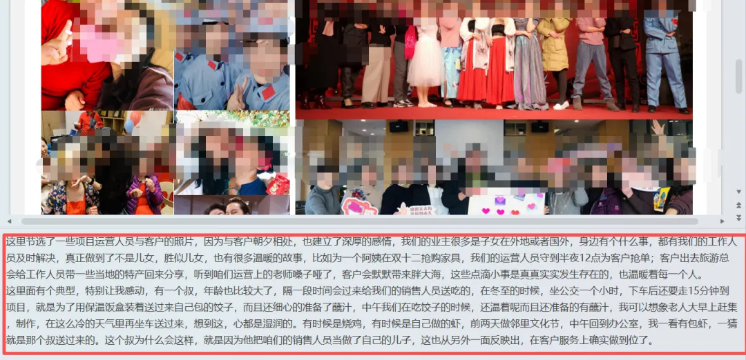 这里节选了一些项目运营人员与客户的照片,因为与客户朝夕相处,也建立了深厚的感情,我们的业主很多是子女在外地或者国外,身边有个什么事,都有我们的工作人员及时解决,真正做到了不是儿女,胜似儿女,也有很多温暖的故事,比如为一个阿姨在双十二抢购家具,我们的运营人员守到半夜12点为客户抢单;客户出去旅游总会给工作人员带一些当地的特产回来分享,听到咱们运营上的老师嗓子哑了,客户会默默带来胖大海,这些点滴小事是真真实实发生存在的,也温暖着每一个人。