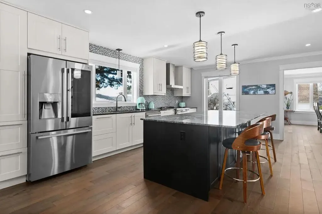 进入屋内,通透明亮,采光极佳。宽敞的门厅通向主层开放式厨房和家庭活动室,厨房配备一个9英尺x4.5英尺的岛台,岛台面采用精美花岗岩,空间宽敞。主楼层还包括正式餐厅和客厅、家庭办公室、两件式卫生间和一个宽敞的杂物间。
