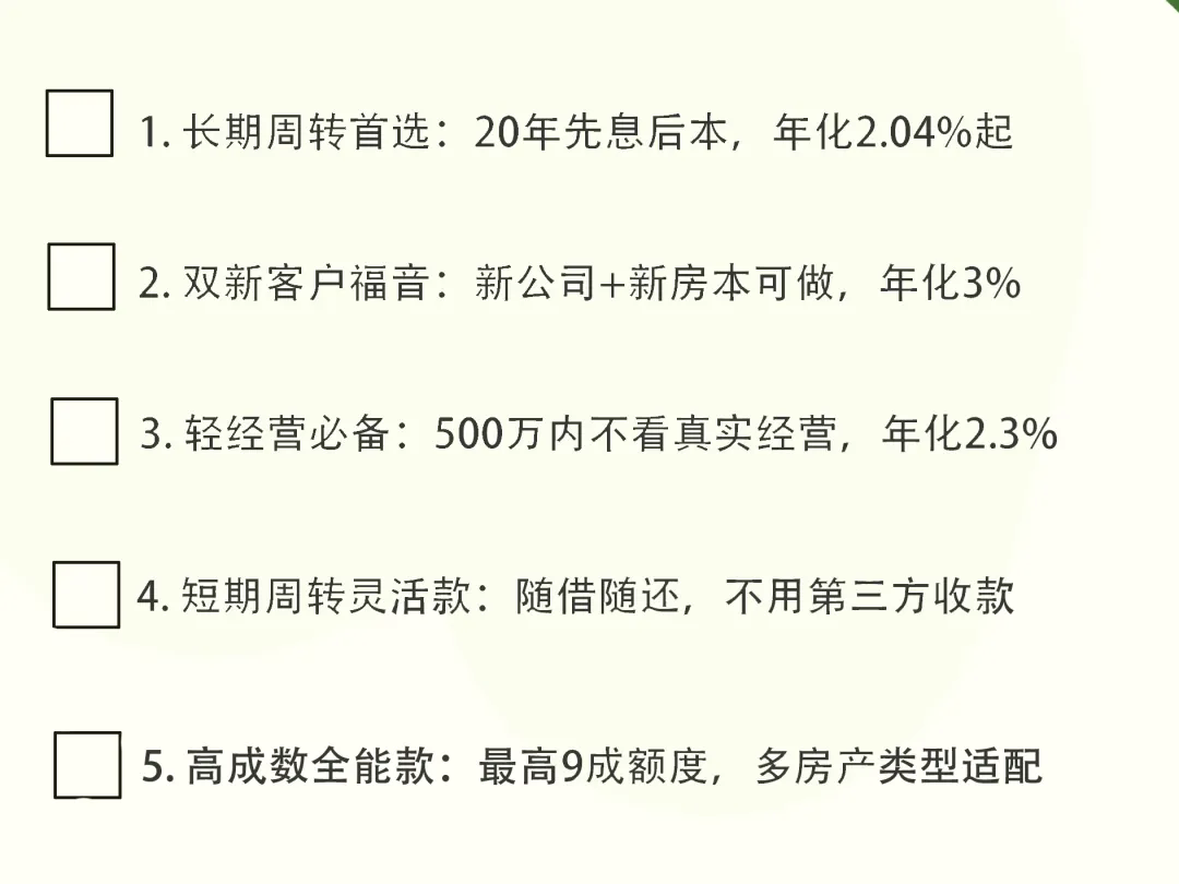 多元化解决方案: 无论是面对目前很多人网贷多、周期短、利息高等问题,进行负债优化置换:还是需要个人消费贷、大额房屋抵押经营贷、企业贷,我们都能基于您的核心诉求,提供科学、可行的方案,帮您降低综合成本,达到目的。