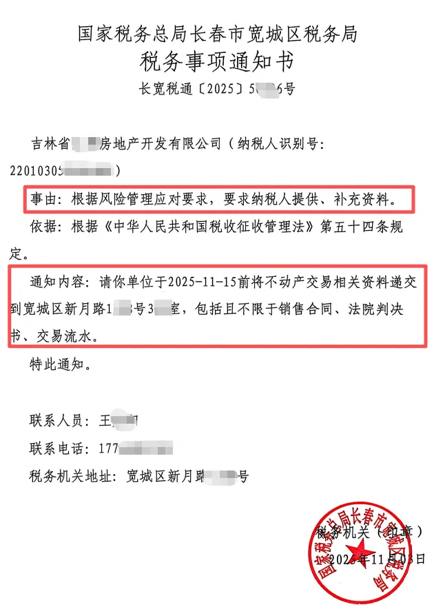 通知内容:请你单位于2025-11-15前将不动产交易相关资料递交到宽城区新月路1188号305室,包括且不限于销售合同、法院判决书、交易流水。