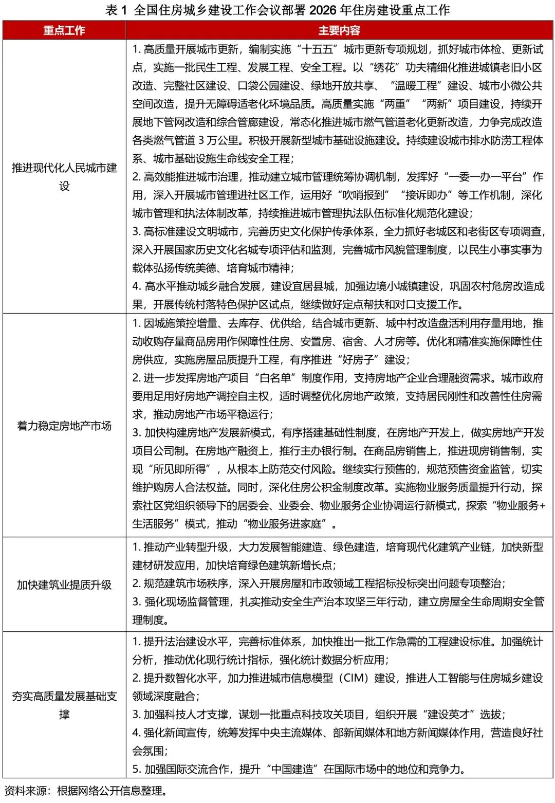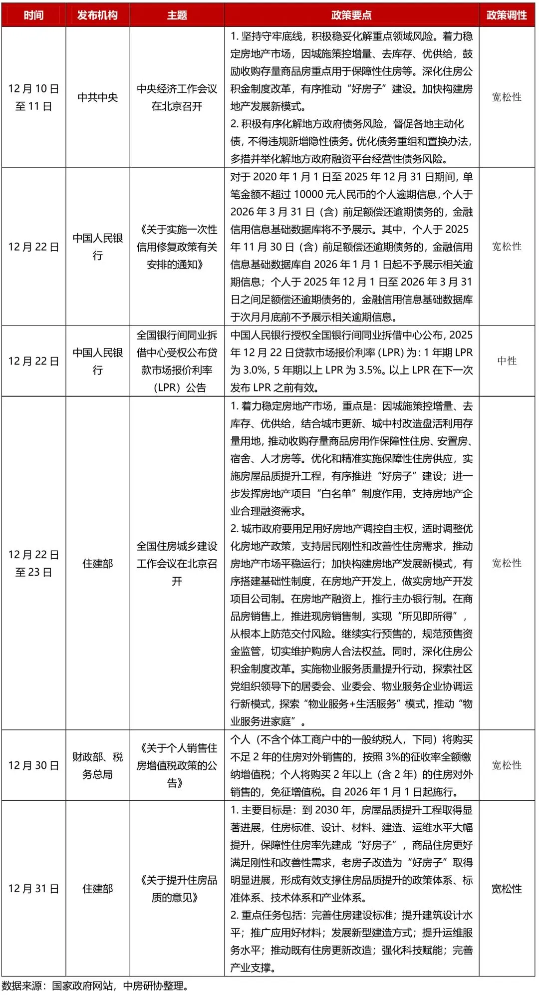 2025年12月,我国房地产政策环境持续宽松。中央层面,中央经济工作会议强调要积极稳妥化解风险,着力稳定房地产市场;全国住房城乡建设工作会议对2026年房地产工作作出具体部署,重点聚焦三条主线:一是因城施策控增量、去库存、优供给,二是进一步发挥房地产项目“白名单”制度作用,充分发挥城市政府调控自主权,三是加快构建房地产发展新模式,有序搭建基础性制度等。