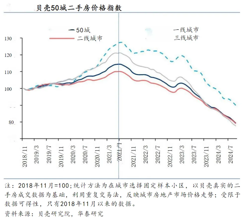 事实上,从二手房价格走势来看,真实的房价水平从2021年7月就开始见顶回落,2023和2024两年加速下行。贝壳50城二手房价格指数显示,到2024年9月政治局会议为止,50城最大价格回撤幅度已经达到30.5%,个别城市跌幅甚至达40%,这与大多数人的“体感”比较接近。