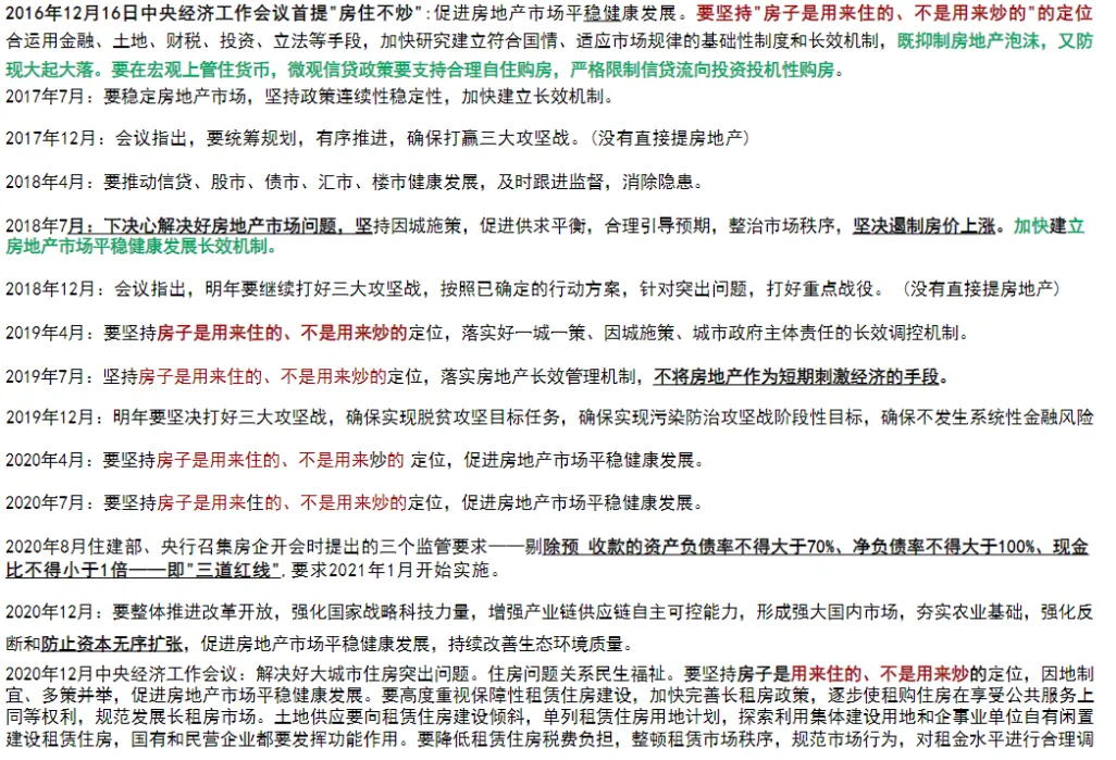 回顾一下这八年来政治局会议关于房地产的措辞,一次比一次严厉,字字见血:2016年12月“房住不炒”之后,2018年7月“下决心解决好房地产市场问题…….坚决遏制房价上涨”。2019年7月, 随着经济下行压力增大, 当市场普遍预期房地产政策调控或结构化边际松动的时候, 政治局会议明确提出“不将房地产作为短期刺激经济的手段”,坚决打消了再次刺激房地产的预期。2020年12月提出“防止资本无序扩张”,为资本设置红绿灯,引导资本进入新质生产力领域,而房地产、平台经济、教培被列为无序扩张的重灾区。2021年发出“清场令”,前面一节已经详述过了。