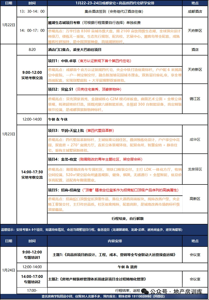 【重庆站·1月16-17日】《走进重庆——重庆第四代住宅研学:产品创新、设计成本平衡、精细化管控多维体系下的产品突围深度研学【6大项目考察+两场分享会】》活动将带您走进万华·麓悦江城(改善型第四代住宅标杆,生态庭院+垂直绿化典范)、中诚两江印(刚需小四代新标杆,90-105㎡高赠生态三房)、香港&华润置地观宸(改善双挑空标杆,6.2米挑空全景庭院)、海成云湖郡(刚需小四代优选,89㎡“花池+宽厅”灵动户型)、龙湖御湖境(改善型第四代升级之作,143㎡“双挑空+空中花园”户型)、建发望江江云启(新中式第四代住宅代表,生态与国风美学融合)、联发嘉和府(低密第四代创新项目,墅级挑空体验)队拆解第四代住宅户型巧思、成本管控与技术落地经验,帮您精准把握“好房子”核心逻辑,拓展行业资源。主办方地产房训库+V:zhumyself
