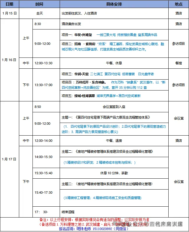 【武汉站・1 月 16-17 日】《1 月 16-17 日 走进武汉好房子项目|第四代住宅 + 高品质项目产品力提升:景观全流程管控体系及精装项目全过程精细化管理深度研学》活动将带您走进华发・外滩玺(武昌滨江一线江景大宅,纯板楼改善盘玺系高端作品)、招商・紫荆府(超第四代住宅,武昌主城府系精工大宅,城芯全维配套定制改善住区)、华润・天宸(二七滨江第四代住宅,低密奢装,日光盘传奇)、万科经开・东合映象(武汉经开映象系首作,新四代纯改善住宅高性价比红盘)、绿城・桂湖雲翠(武昌二环月华系湖居标杆,第四代住宅无界曲面屏设计)、理想・之地(城市新核理想生活范本,都会森居社区全维场景焕新日常质感)、华润置地・长江天际(武昌滨江国际艺术大平层,户户瞰江板式社区),深度拆解第四代+第五代住宅好房子产品创新逻辑、景观全流程管控要点及精装项目全过程精细化管理经验,帮您精准把握高品质项目产品力提升核心逻辑,拓展行业资源活动
