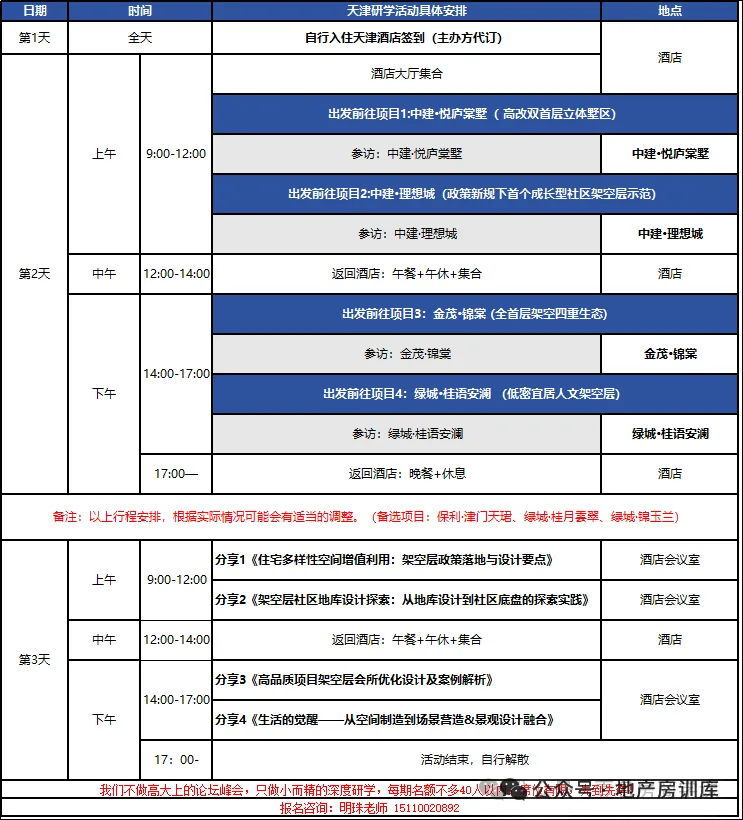 2.标杆项目实地参访,沉浸式学习实践:精选4-5个天津本地全首层架空层政策落地标杆项目,涵盖不同开发体量、不同设计风格,重点开放架空层会所、地库核心区域、景观融合节点等关键空间,配备项目核心设计师现场讲解设计思路与落地心得。项目案例深度贴合北方气候、人居习惯等地域特性,可为北方城市的架空层设计提供可落地、可借鉴的有效范本。
