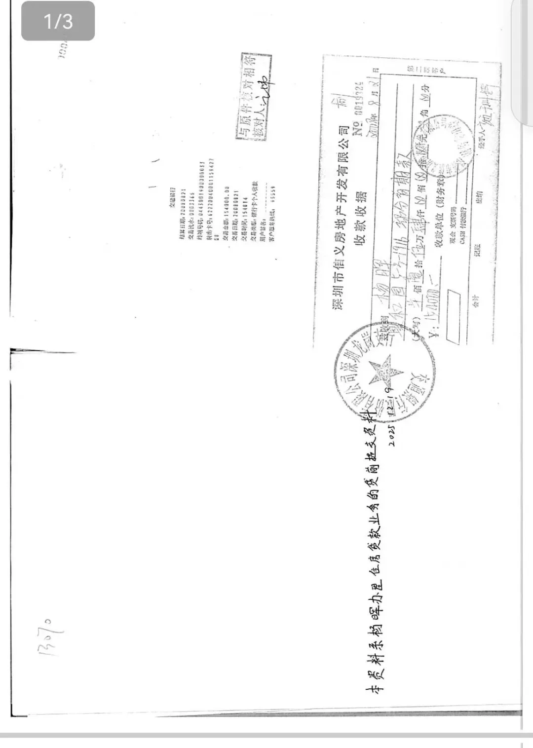 8月21日,首付款154,000元(这笔款项详实,交易终端号0443001900000033,时间与信义地产自己开具的收据完全吻合)。
