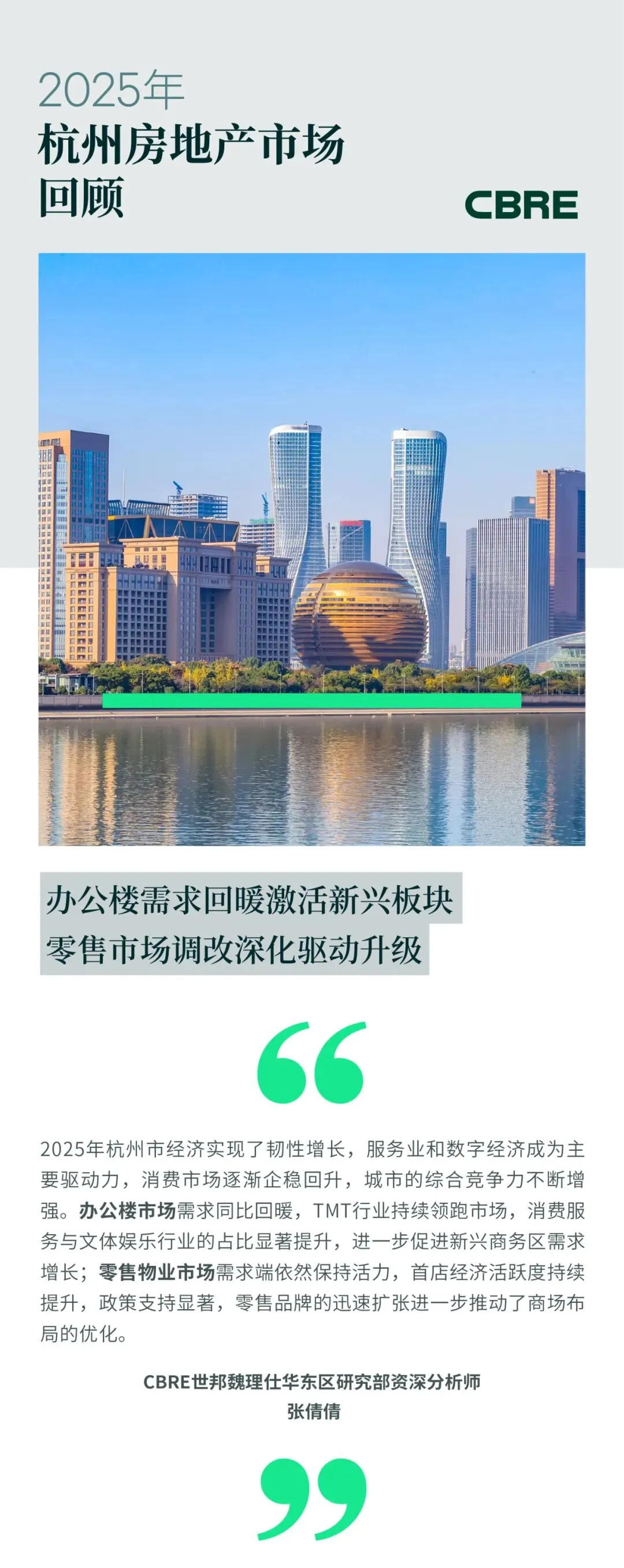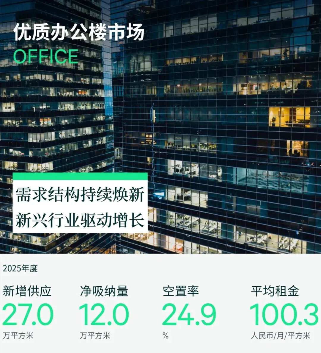 2025年,杭州办公楼市场共录得6个新项目入市,新增体量合计27万平方米,其中第四季度贡献了3个新项目——杭州恒隆广场一期、IOC·杭州国际办公中心以及潮博中心。全年累计净吸纳量达到12万平方米,同比增长17.8%。全市空置率同比上升1.0个百分点至24.9%。