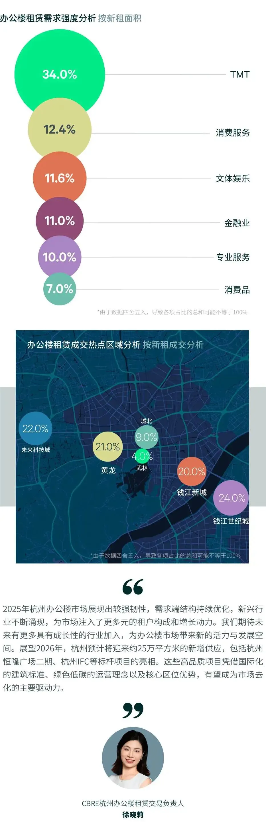 全年来看,TMT继续保持领先地位,占比提升至34%,其中直播电商类企业最为活跃,钱江世纪城、未来科技城等新兴板块表现尤其突出;消费服务业以12.4%的占比跃升至第二位,主要来源于留学教育机构以及美容诊所等服务行业的扩张,体现出消费者对个人提升的日益重视;文体娱乐业以11.6%的占比位居第三,也是文娱业此次首进前三,主要受益于杭州年轻化的消费结构和娱乐创新产业的兴起;金融业以11%的占比位居第四,保险与投资机构贡献突出;专业服务业占比10%,排名第五,律所、咨询公司的搬迁扩张为其主要需求。
