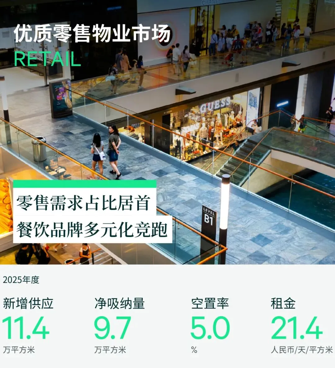 截至年末,全市空置率同比上升0.4个百分点至5.0%。租金方面,全市购物中心首层租金同比下降0.5%,报每天每平方米21.4元。