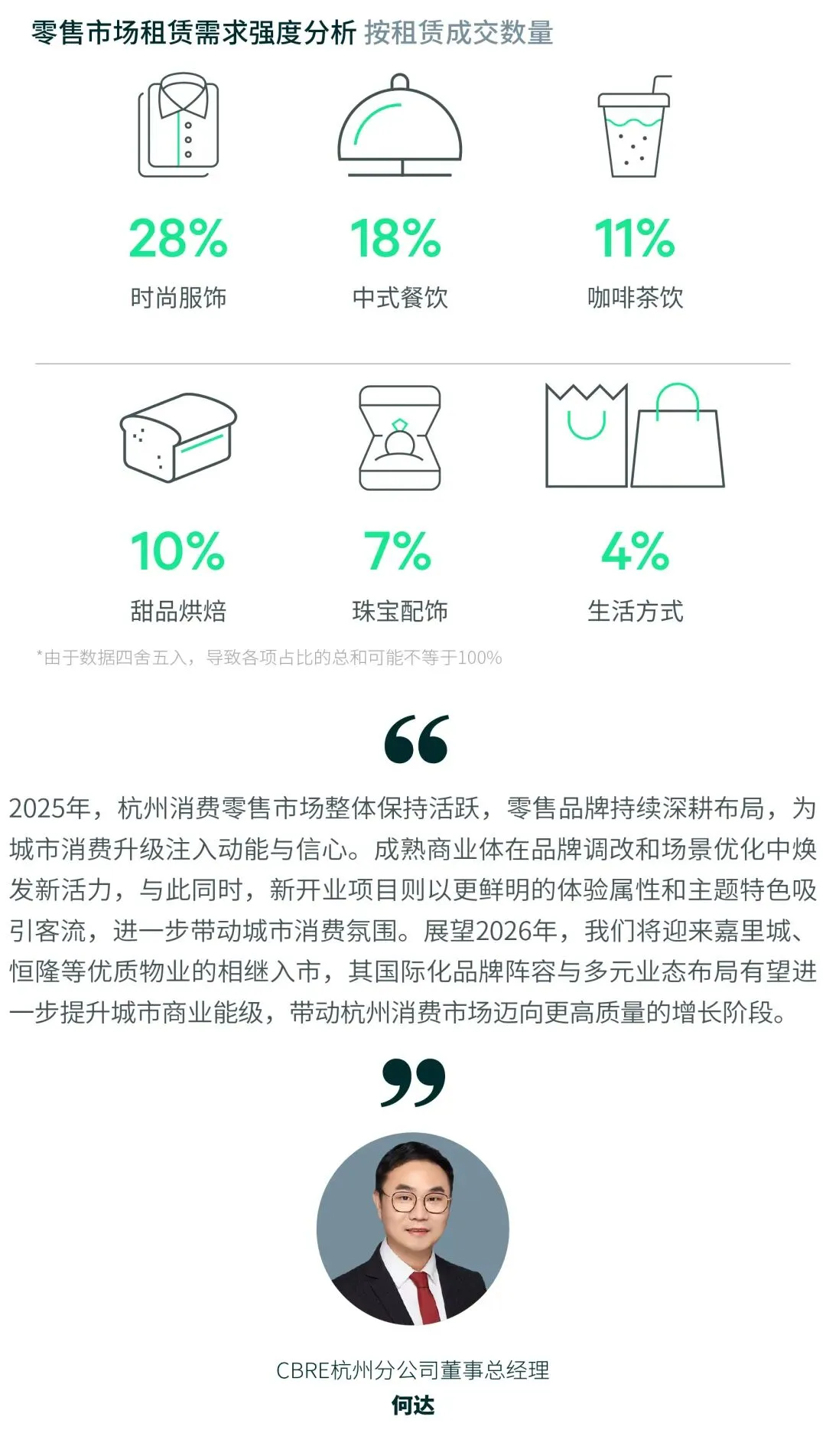 餐饮业态需求占比46%,多元化趋势显著,海外品牌快速扩张。上半年,贵州、江西等中式地方餐饮持续走红,阿嬷手作等地方茶饮品牌也备受关注。下半年,更多海外尤其是亚洲的平价菜系加速进入杭州市场。例如,寿司郎自第一季度在in77开出首店后迅速扩张至五家门店;日本人气汉堡品牌Shogun Burger近期也正式落地来福士。整体来看,2025年餐饮品牌调改的丰富度显著增强,其中中式餐饮占比18%,亚洲餐饮占比6%,咖啡茶饮及烘焙甜品则分别占比11%与10%,呈现出多元竞跑的格局。