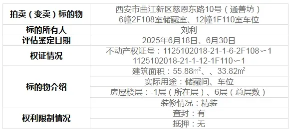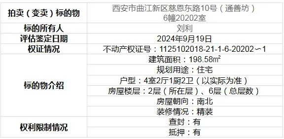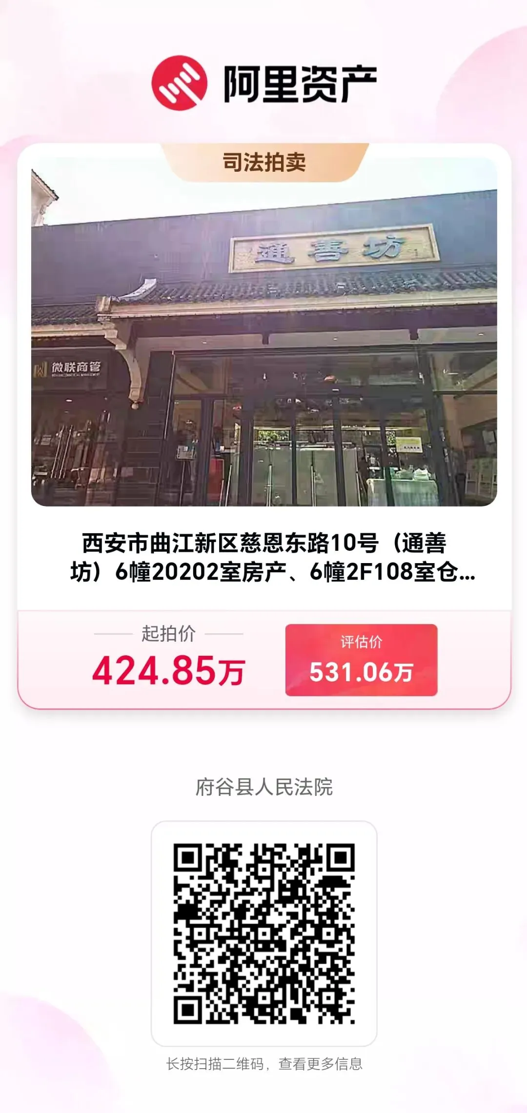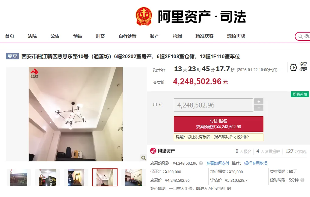 1月22日10时至3月23日10时,府谷法院将在淘宝网司法拍卖平台上,变卖西安市曲江新区通善坊房产、仓储及车,424万元起拍!