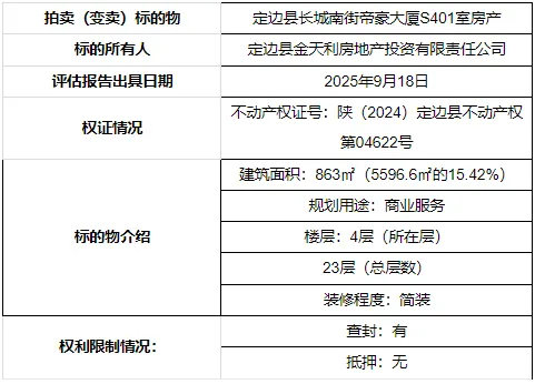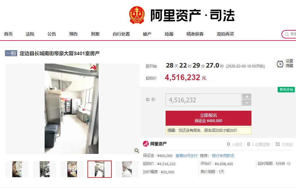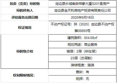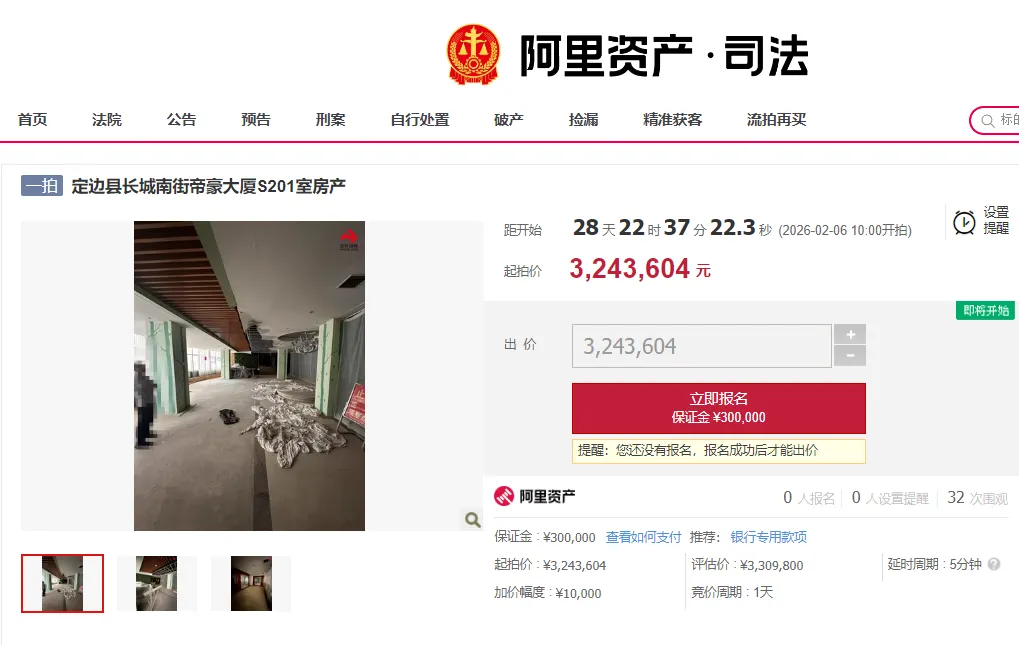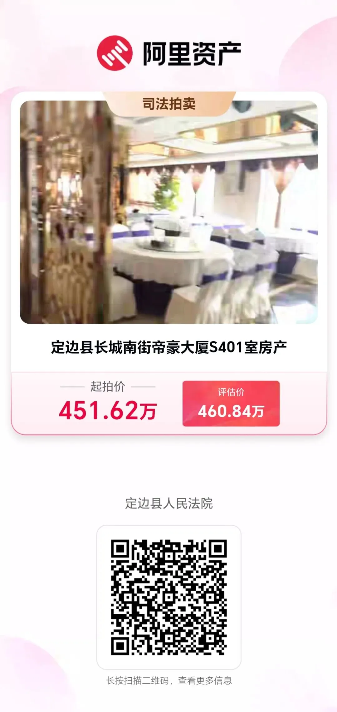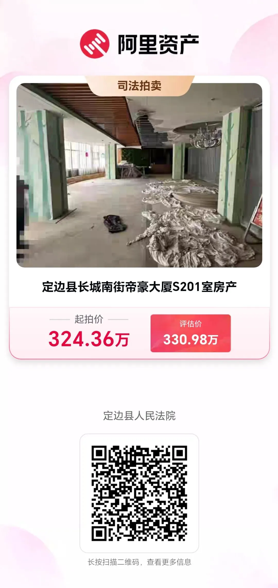 2月6日10时至7日10时,定边法院将在淘宝网司法拍卖平台上,拍卖定边县长城南街帝豪大厦两处房产,速来了解!