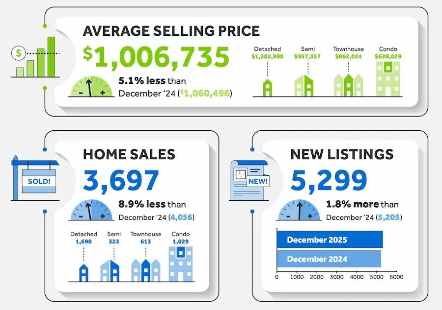 平均售价为 1,006,735 加元,较 2024 年 12 月下降 5.1%。经季节性调整后,12 月份房屋销售量较 2025 年 11 月略有下降,而新挂牌房源数量有所增加。MLS® HPI 综合指数较 11 月份略有下降,而平均售价则略有上升。