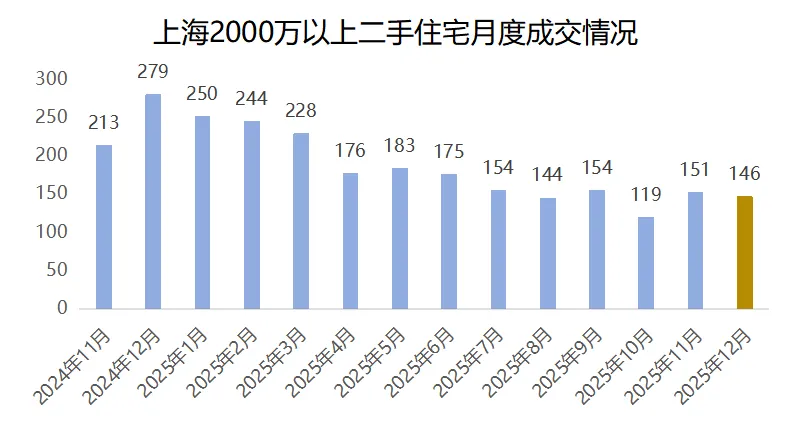 12月,全市2000万以上二手住宅共计成交146套,环比上月小幅下降,与11月基本相当,交易量总体依旧稳定。