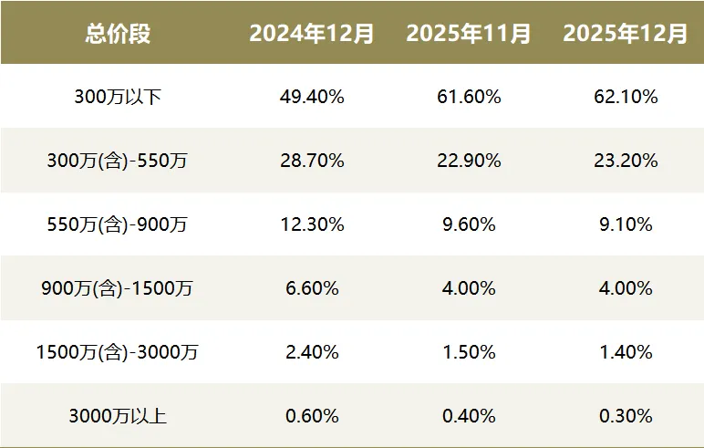 二手房市场走出了一条“以价换量”的稳健复苏路线,呈现出“价格跌、交易活”的特征。并且,随着交易量回升,二手房价的下跌幅度正在收窄,部分核心区域房价已出现企稳迹象。从成交结构来看,刚需占比进一步提升是成交回暖的主要原因。最新的机构统计数据显示,12月上海300万以下二手房成交占比达到62.1%,占比达到近五年的峰值。总体来看,12月的上海二手房交易呈现出清晰的结构性分化。在居住需求的驱动下,成交意愿强劲,表现为刚需“以价换量”,带动市场筑底回暖。