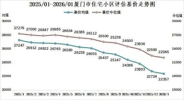 中利:2026年01月,厦门市住宅小区评估基价均值为22357元/平,环比下降1.62%,同比下降17.95%;