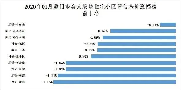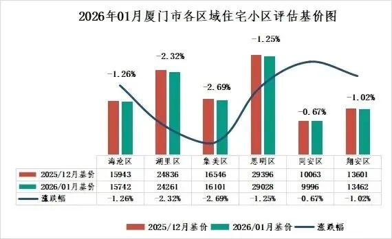 2026年01月份,厦门市各区域版块的住宅小区评估基价均呈现下跌的趋势。