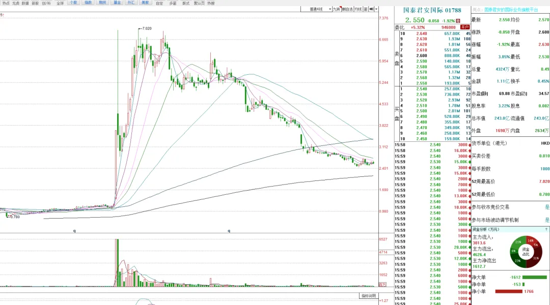 比如,国君国际,从七毛飙升到七块的时候。