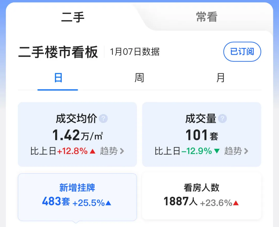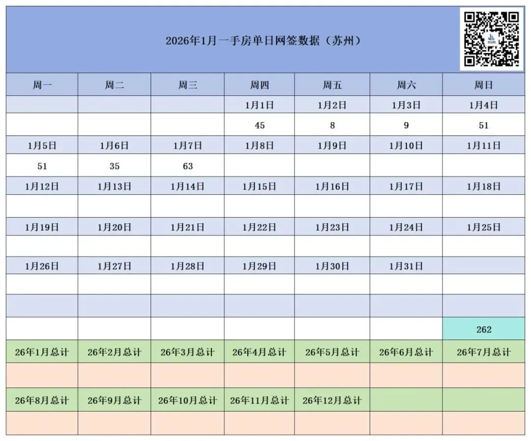 本月截至1月7日(周三),苏州六区住宅累计网签【1076套】,其中二手房累计网签【814套】、新房累计网签【262套】。