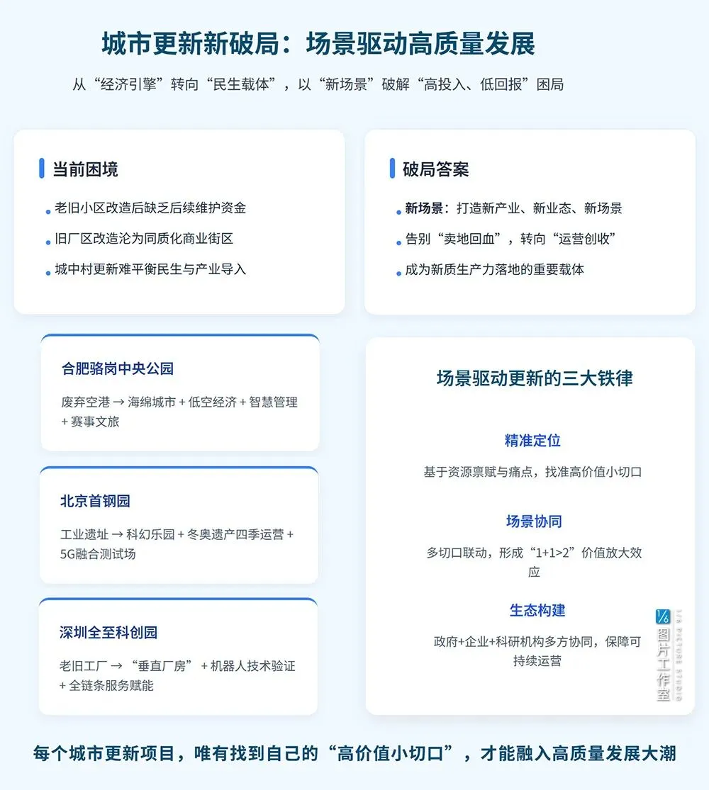 说白了,以后城市更新不能再靠卖地回血了,得找到「新出路」,而「新场景」,就是那个「新出路」。
