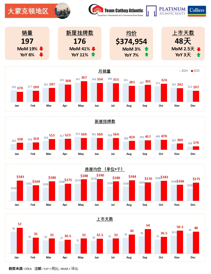 销量仅为117套,环比降幅高达33%,是三地中收缩幅度最大的。供应侧也极度紧张,新屋挂牌数降至87套,环比降幅达到52%,年同比也下降了9%,充分体现了年末卖家入市意愿的低迷。房屋均价为$338,276。虽然价格环比微跌1%,年同比下降高达9%。是三个城市中唯一同比下滑的地区。同时,流动性保持在较高水平,上市天数仅为26天,环比下降3.5天。这表明尽管交易清淡,但市场上的房源仍在被迅速消化,供需矛盾依然突出,长期价值增长稳固。弗莱地区(弗雷德里克顿)市场在12月展现出独特的需求韧性。
