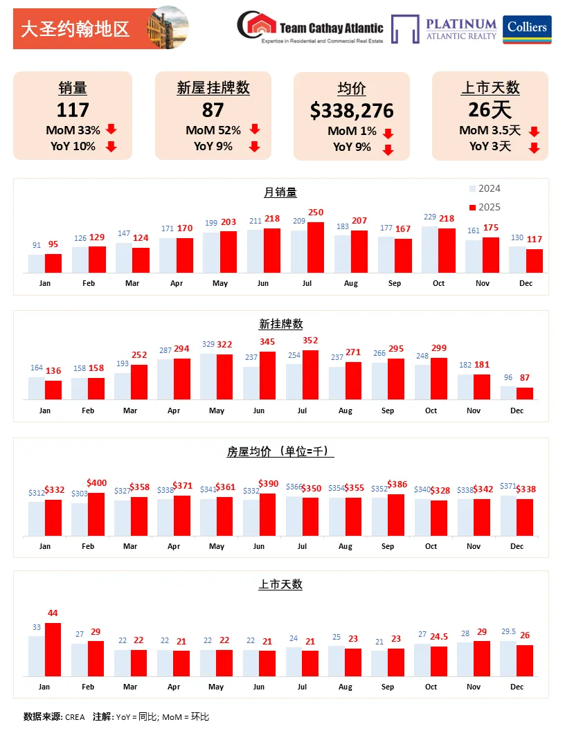 更值得注意的是,均价环比(MoM)逆势上涨了3%,年同比(YoY)增幅达到7%。这一趋势表明,蒙克顿地区拥有足够强劲且持续的需求基础,有效抵抗了年末交易量下滑带来的价格压力,并支撑了房价的继续上行。在市场流动性方面,该地区的上市天数(DOM)为48天,虽然去化速度慢于其他两地,但环比仍减少了2.5天,显示出流动性在年末略有改善。蒙克顿无疑是加东市场中价格表现最为稳固的支柱。大圣约翰地区在12月份遭受了最剧烈的季节性收缩。