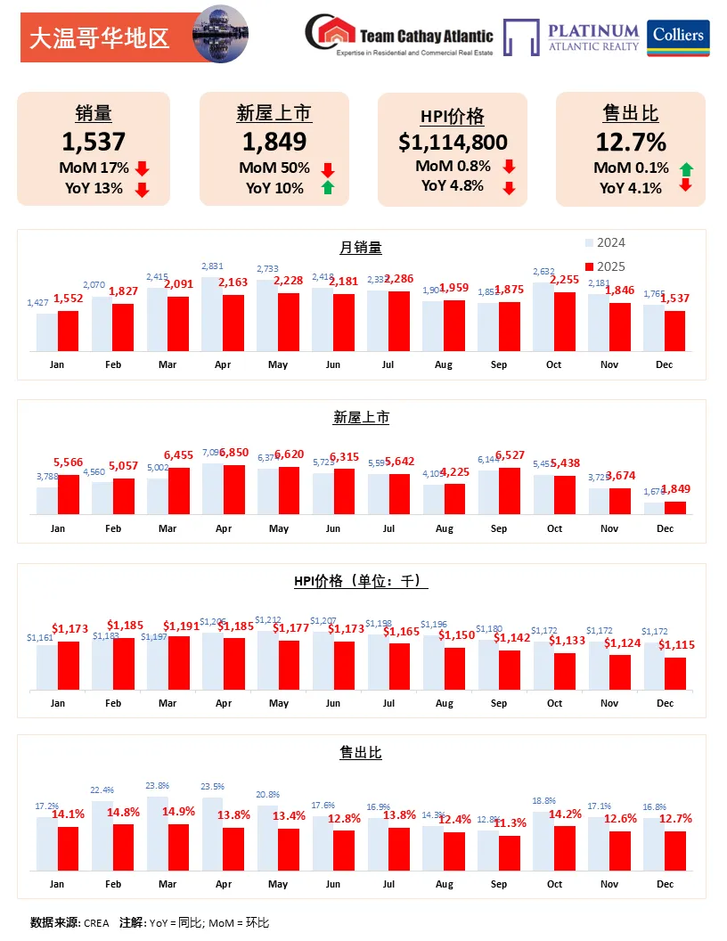 尽管新挂牌数环比降幅高达53%,是三地中最大收缩幅度,但其销量虽然环比下降了19%,但实现了年同比14%的强劲增长,是唯一实现两位数增长的地区。在价格方面,房屋均价为$336,213。该地区环比回调最为明显,价格下降了6%,但年同比仍保持了3%的增长,年度增值趋势得以维持。弗莱地区最大的亮点在于其市场流动性:上市天数仅为24天,环比下降5天。这是三个市场中最低的DOM,表明弗莱地区的房源消化速度最快,流动性表现最佳。在供应极度紧张的情况下,强劲的年同比销量增长和快速的房源去化速度,彰显了该地区潜在需求的活跃度。2025 年的大温房地产市场呈现出“高库存、低成交、价格承压”的特征。尽管全年成交量创下二十多年来新低,但卖家挂牌意愿依然强劲,市场供应处于历史高位,买方选择充足。