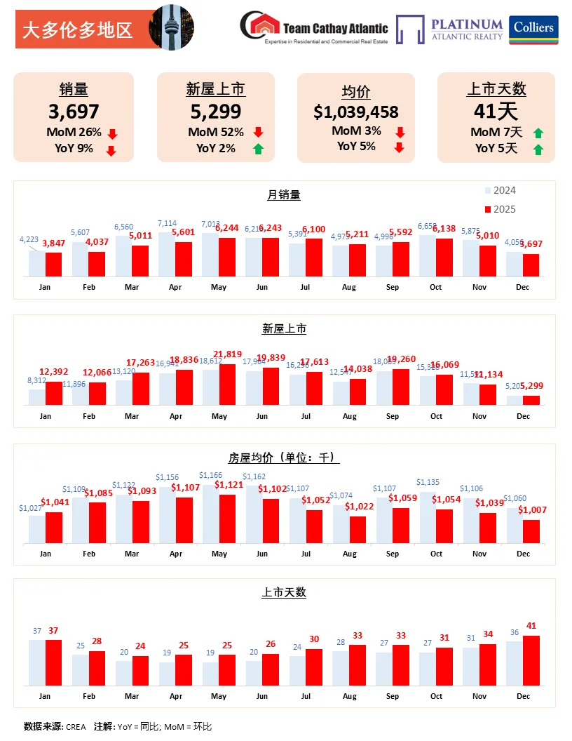 2025 年,大多伦多地区房屋成交量相比 2024 年明显下降,主要原因是经济不确定性持续存在,影响了消费者信心。同时,房源供应量保持在较高水平,使买方在议价时更有优势,推动房价回落,整体购房负担能力有所改善。
