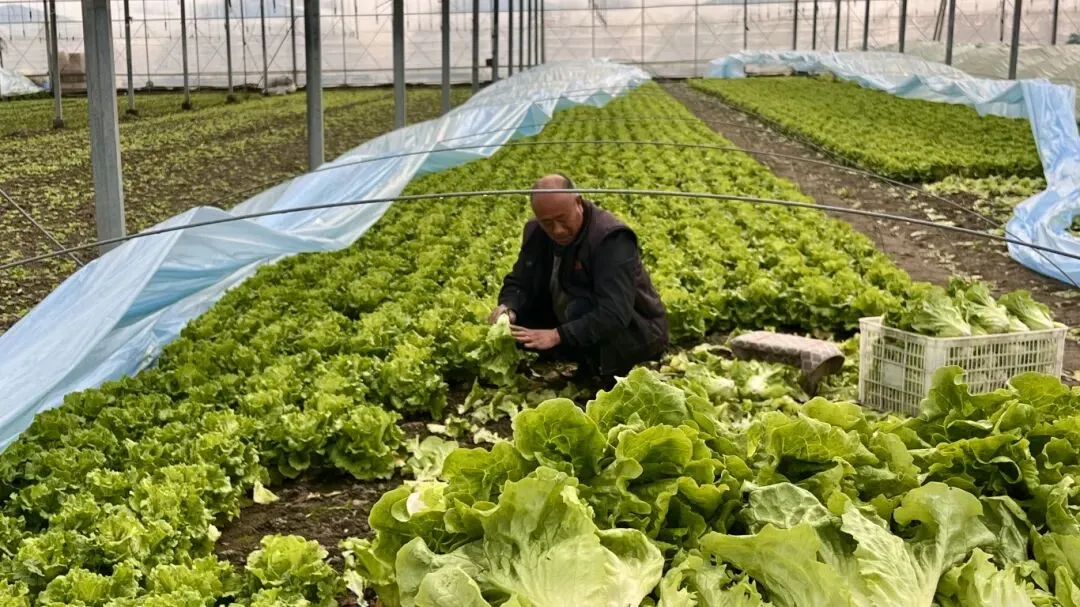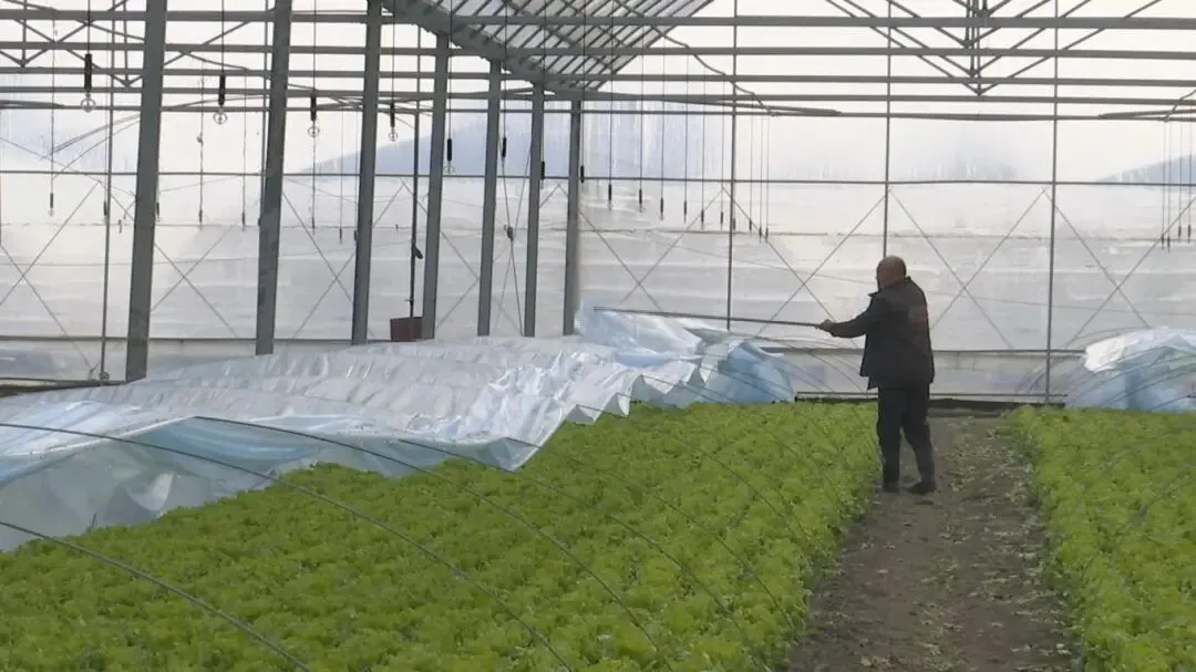 上午,古里镇康博村的蔬菜基地里,农户们正忙碌地采收生菜。成片的生菜鲜嫩翠绿、长势喜人。进入小寒节气后,常熟气温持续低于零度,农户们在大棚内加设了二层保温拱棚,有效防止蔬菜受冻。