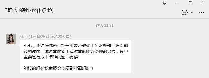 在圈里的资源对接,看见只要有老师发出寻求同行合作的帖子,当天就会有来自各方的伙伴联系,合作模式是有人专门负责账务处理,有人专门负责本地跑腿,利润三七分,丝滑的合作模式瞬间拉满。