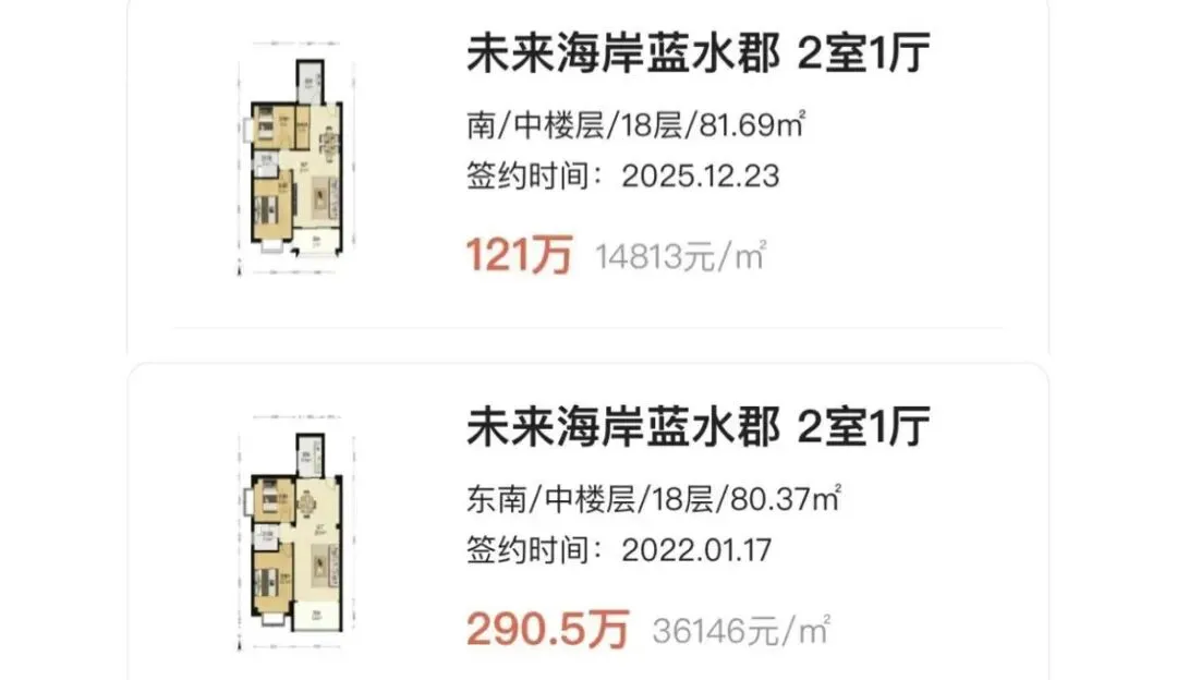海沧体育中心未来海岸蓝水郡,一套81㎡的两房,2022年成交290.5万,如今121万成交,跌了快170万……这些数字背后,都是房东真金白银的让步。市场观望情绪依然浓厚,买家不看到“跳楼价”很难心动。再加上厦门新房库存压力大、价格也在“内卷”,分流了不少购房需求。所以二手房东想快速出货,除了降价,似乎没有太多选择。