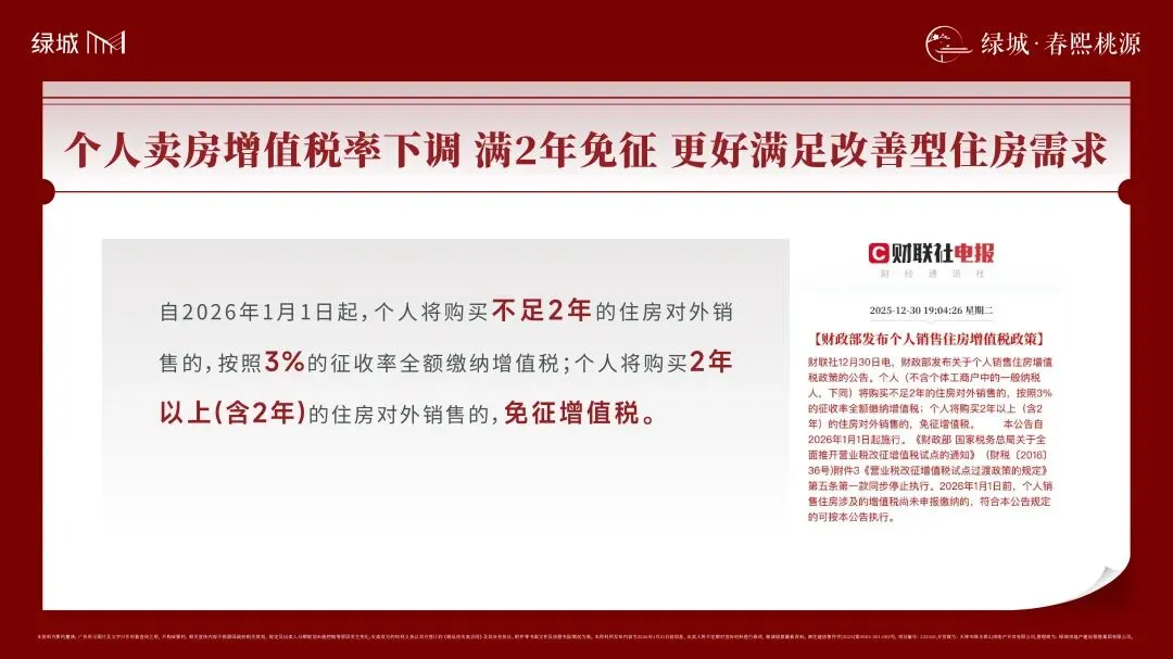 月供负担切实减轻:自2026年1月1日起,存量公积金与商业贷款利率同步下调。首套房贷利率最低可至3.05%,购房成本降至历史低位,切实缓解居民月供压力。增值税优惠加码,激活改善型需求:个人转让购买2年以上(含2年)住房免征增值税;不足2年的住房增值税率按3% 征收。此举显著降低了二手房交易成本,鼓励“以旧换新”、改善升级。