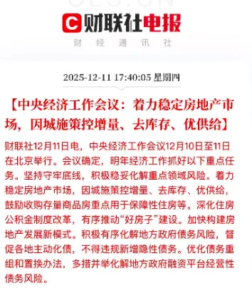 近期,中央接连释放明确信号,为2026年房地产市场注入强劲信心与稳定预期。从政治局会议到中央经济工作会议,一系列政策部署不仅为宏观经济定下“稳中求进、提质增效”的基调,更明确提出“着力稳定房地产市场”,推动行业向高质量发展平稳过渡。中央经济工作会议明确提出“着力稳定房地产市场”,这意味着从宏观层面,房地产市场的稳定发展已成为国家经济工作的重要考量,并为“稳楼市”提出一系列具体措施: