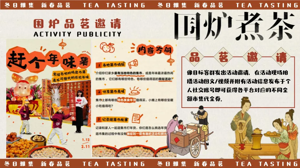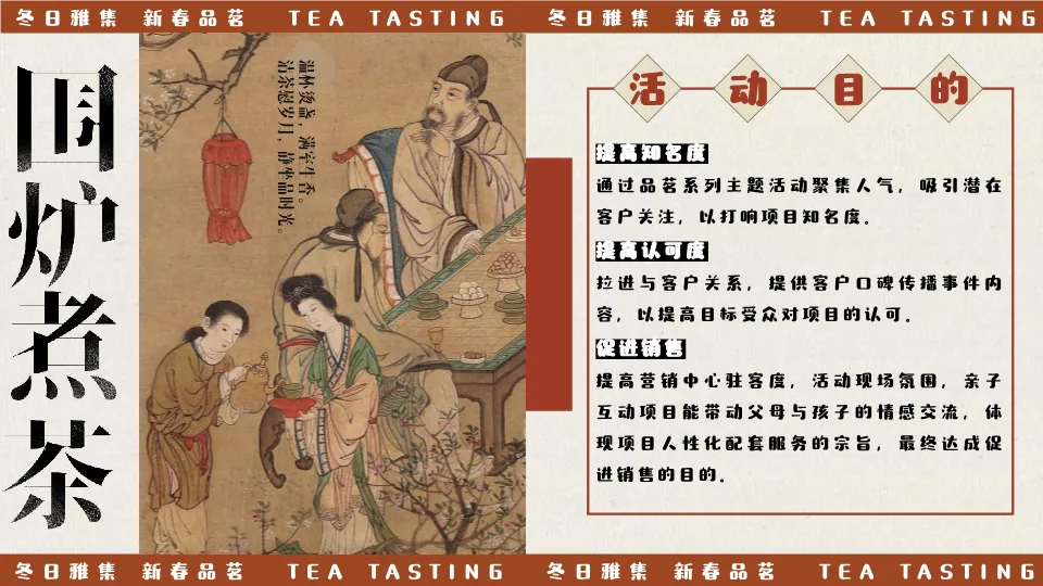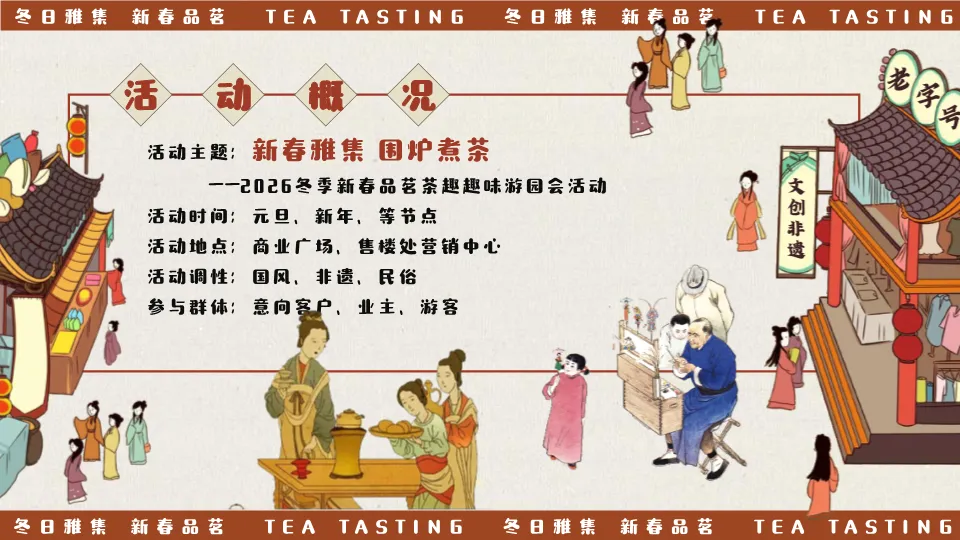 本方案是一份为商场或地产项目策划的2026年冬季新春主题营销活动方案。活动以“新春雅集·围炉煮茶”为核心主题,旨在通过一场融合国风、非遗、民俗元素的茶趣游园会,聚集人气,提升项目知名度与客户认可度,最终促进销售。活动内容设计丰富,涵盖雅趣潮玩民俗、非遗传承、乐器美学、茶香手作四大章节,包括投壶、茶宴、音乐会、手作体验等多元化互动。方案结构完整,详细阐述了活动概况、宣传预热、亮点包装、主体流程及应急预案,是一份可供借鉴的完整活动策划与执行模板。